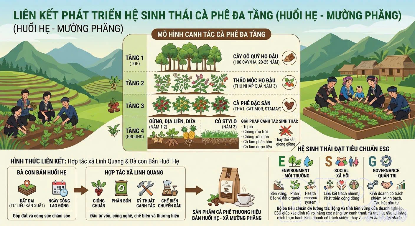 In recent years, crop restructuring in Mường Phăng has yielded positive outcomes as the province expands the area dedicated to various short-term and perennial fruits, industrial crops, and medicinal plants. A standout in this movement is the development of a multi-tiered coffee ecosystem, which represents a holistic and innovative approach to land management.