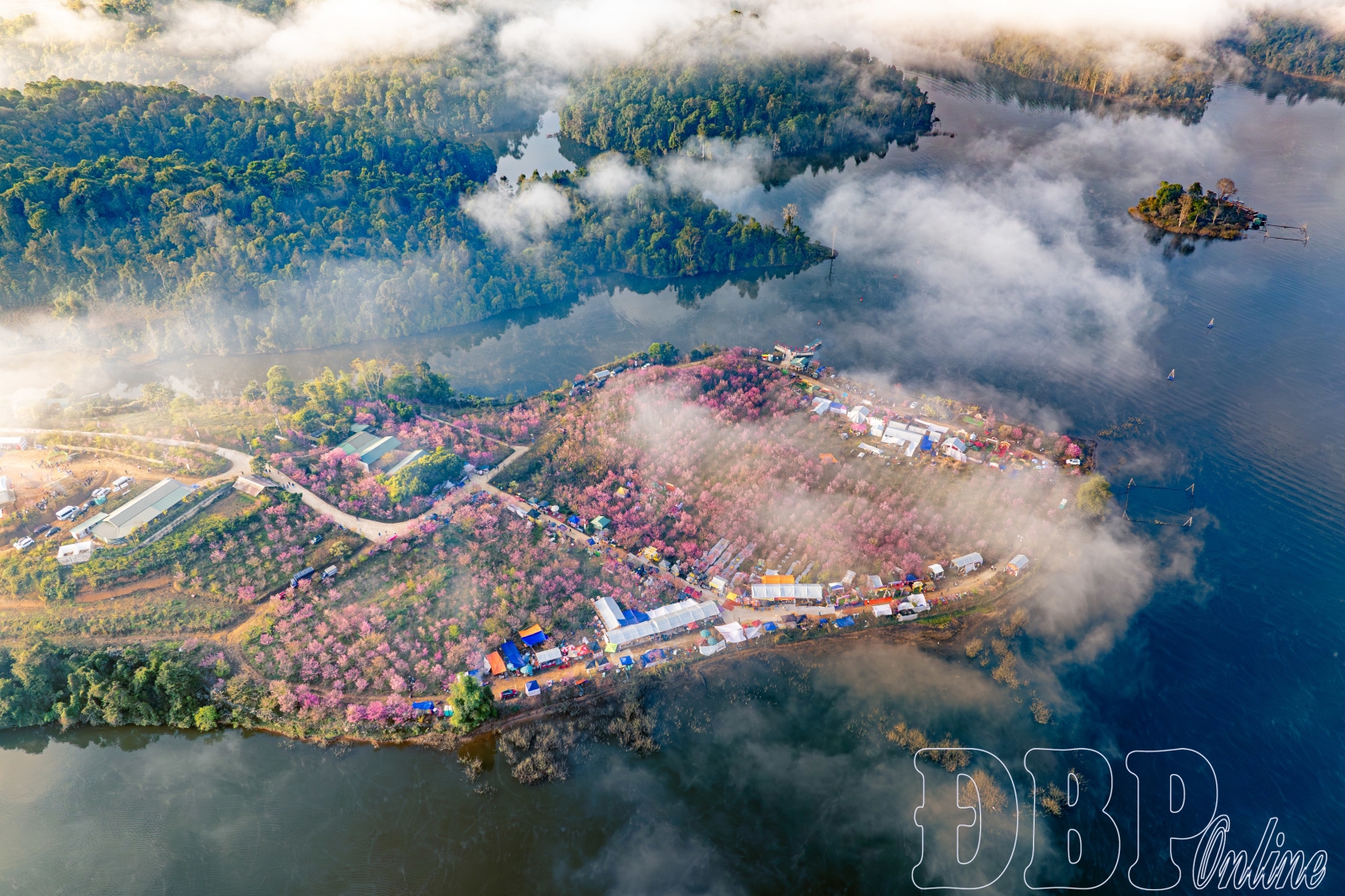 Amidst the early mist still lightly clinging to the canopy, landscape photographers arrived very early to choose positions, align compositions, and catch the first light of the day. From high angles, the entire flower island is captured within the frame with layers of pink stretching out, contrasting softly with the green background of the mountains, forests, and water surface.