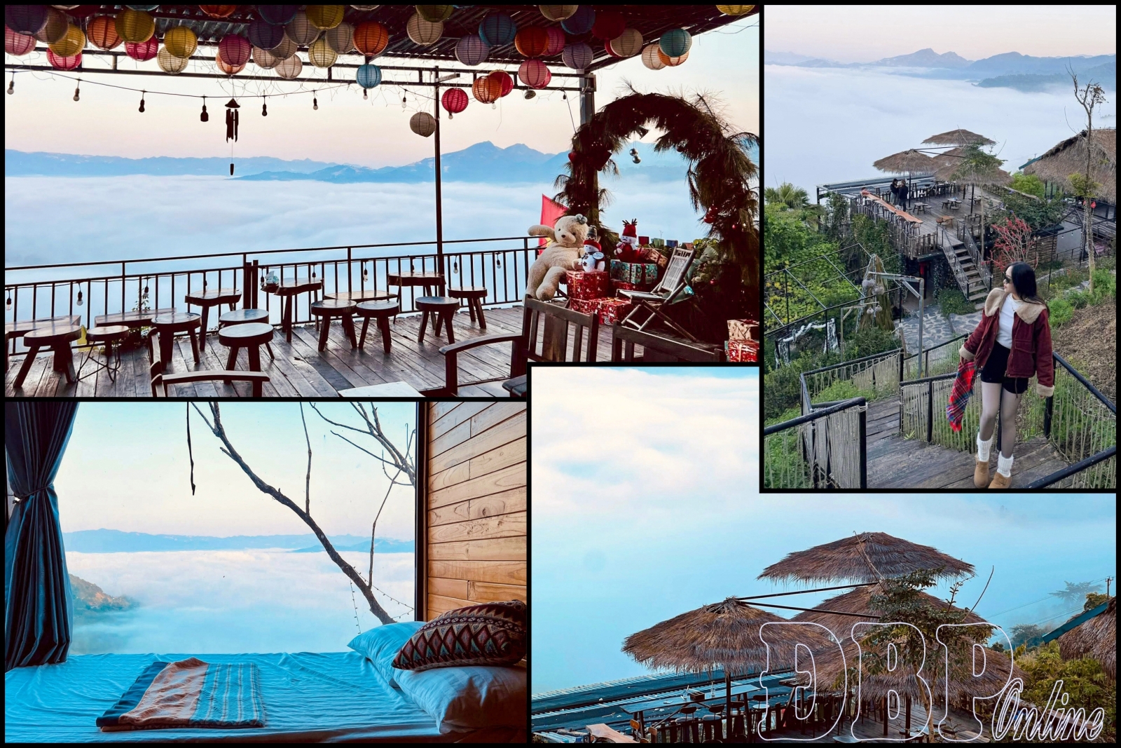From the wooden yard of Ecolodge Kê Nênh, where simple bamboo tables, chairs, and straw umbrellas are placed, looking out at the sea of clouds like an endless white carpet. The dawn light dyes the distant mountain peaks golden, shining down on the thatched roof of the stilt house, making the whole space full of vitality.