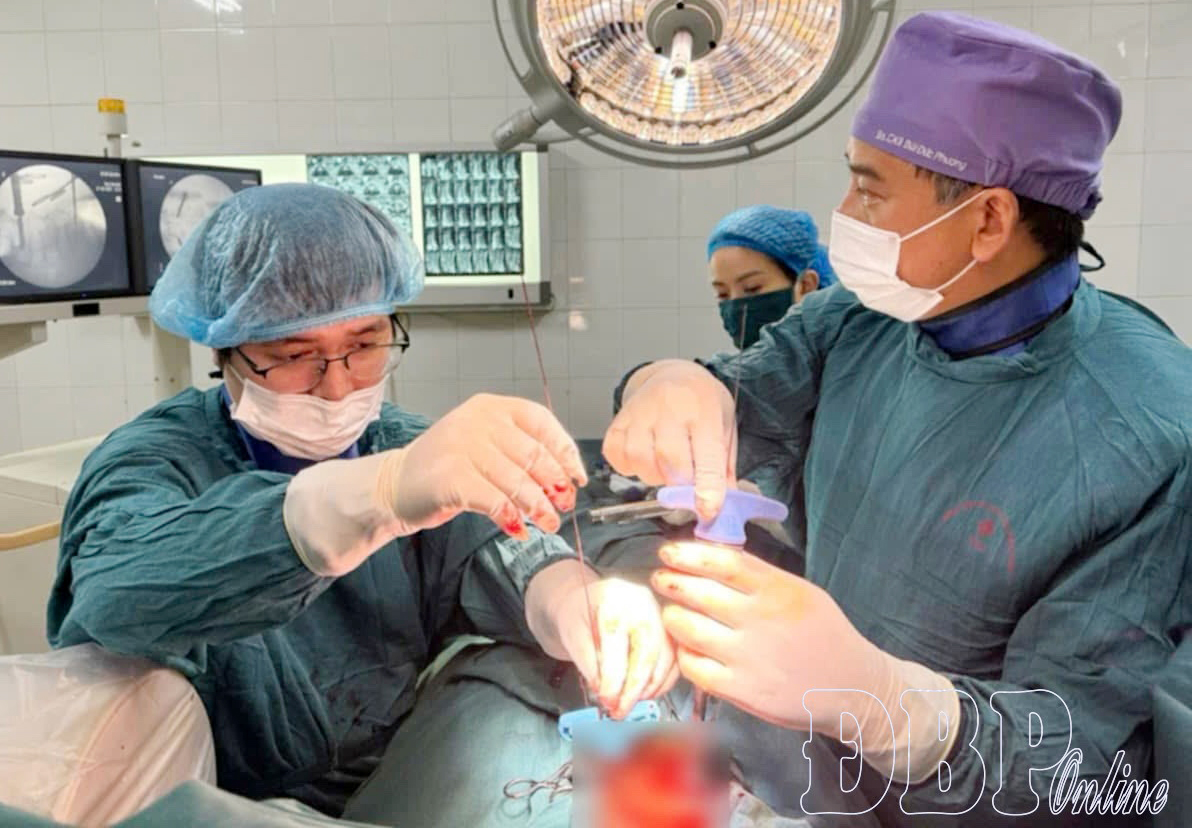 Patient L.T.H. (49 years old, Na Sang commune) fell from a ladder hitting the nape area two weeks prior to admission. Computerized tomography images of the cervical spine showed a crushed vertebral body and fracture of the posterior arch on the left of the C5 vertebral body with mild compression on the spinal canal at that level, a dangerous injury that could cause paralysis if spinal cord compression worsened. The patient underwent surgery to restore the physiological spinal curve, replacing the crushed cervical vertebra with artificial material (titanium cage) for fixation and reconstruction of a solid spinal structure, with the support of the C-ARM system and bone grinding drill. Post-surgery, the patient was alert, pain was significantly reduced, could sit up and move gently, with physiological functions operating normally.