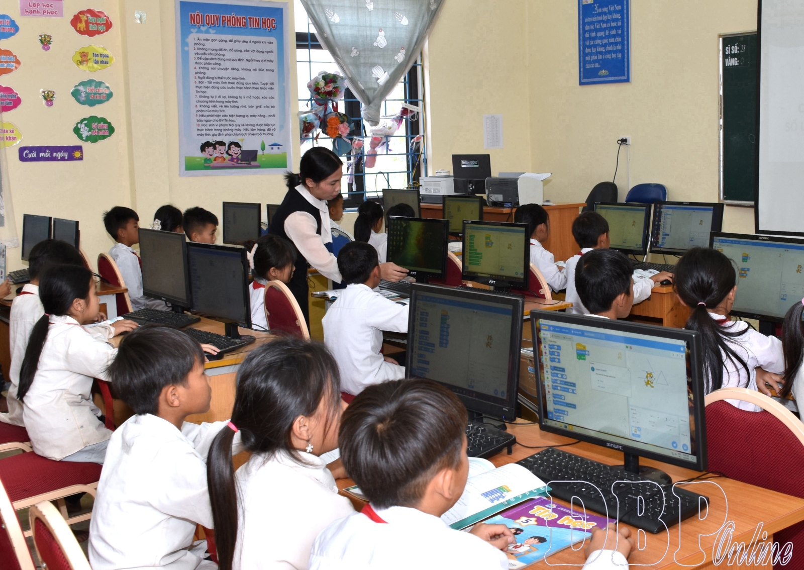 Every Friday morning, the grade 5A IT class at Trần Văn Thọ Semi-boarding Primary School for Ethnic Minority Students in Mường Nhé begins with the rhythmic tapping of keyboards in a small classroom. On the projector screen, a digital lesson comes alive with vivid visuals on how to search for information online. Students actively exchange ideas, guiding one another through the steps. From time to time, excited voices ring out: “Teacher, I’ve done it!” or “Click here!”. The classroom buzzes with energy - a stark contrast to the past, when lessons revolved solely around chalkboards and textbooks.