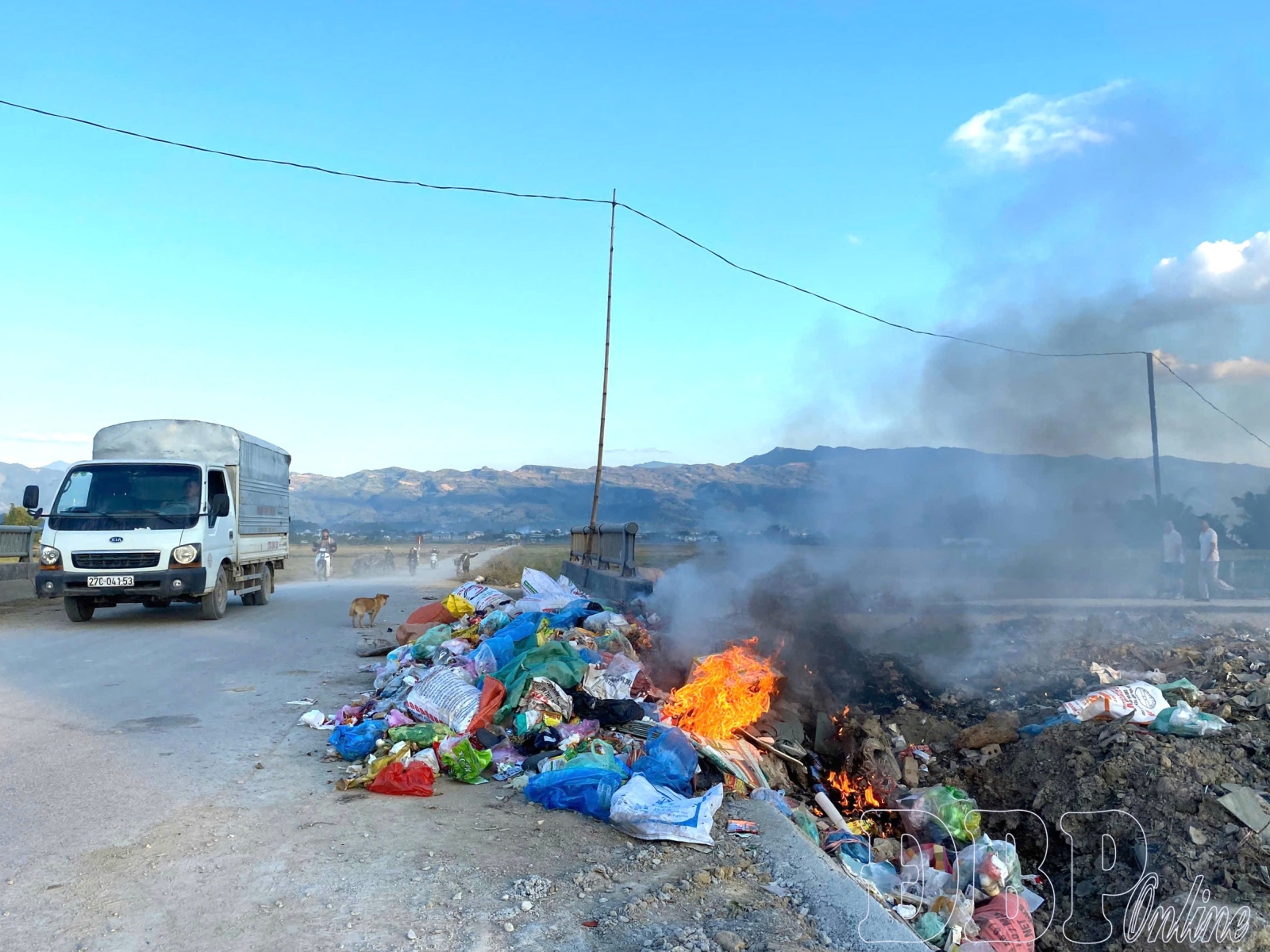 On the inter-village road of Noong Pết, Thanh Nưa commune, large piles of trash lying close to the road edge are a familiar haunting sight for people frequently passing through this area. Domestic waste is mixed with nylon bags, plastic packaging, household scraps, and even hard-to-decompose waste. At times, people burn trash right on the roadside, with thick black smoke rising, causing environmental pollution.