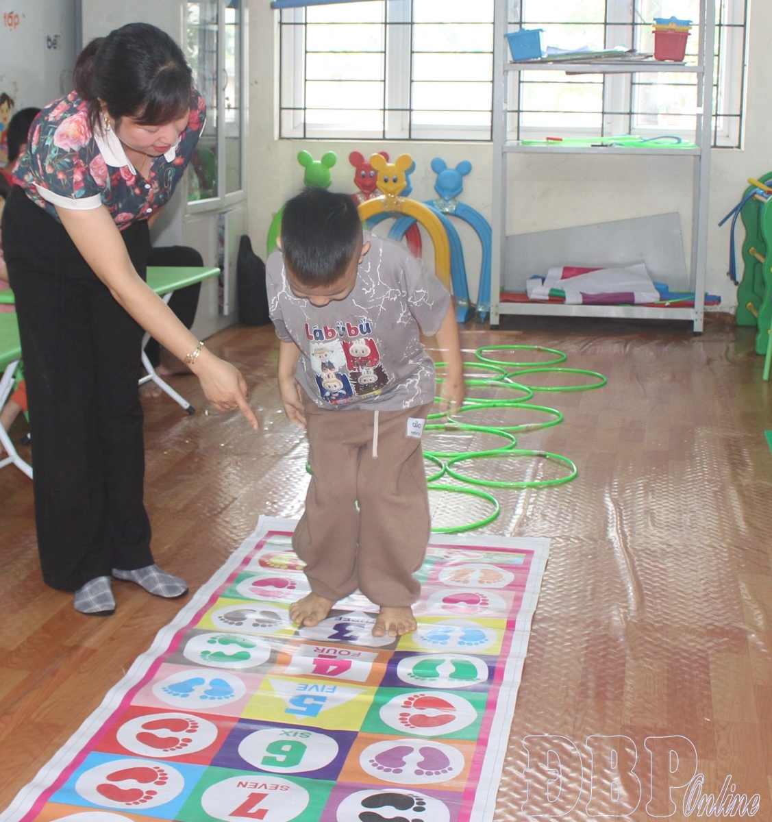 Accordingly, each session begins with sensory stimulation activities: shaking dice, touching different materials... to attract concentration. When the children start paying attention, the teacher uses the “modeling” method, demonstrating simple behaviors such as pointing, looking in the direction the teacher points, or reaching out to receive objects. These eye and hand signals are considered the first steps to establishing communication.