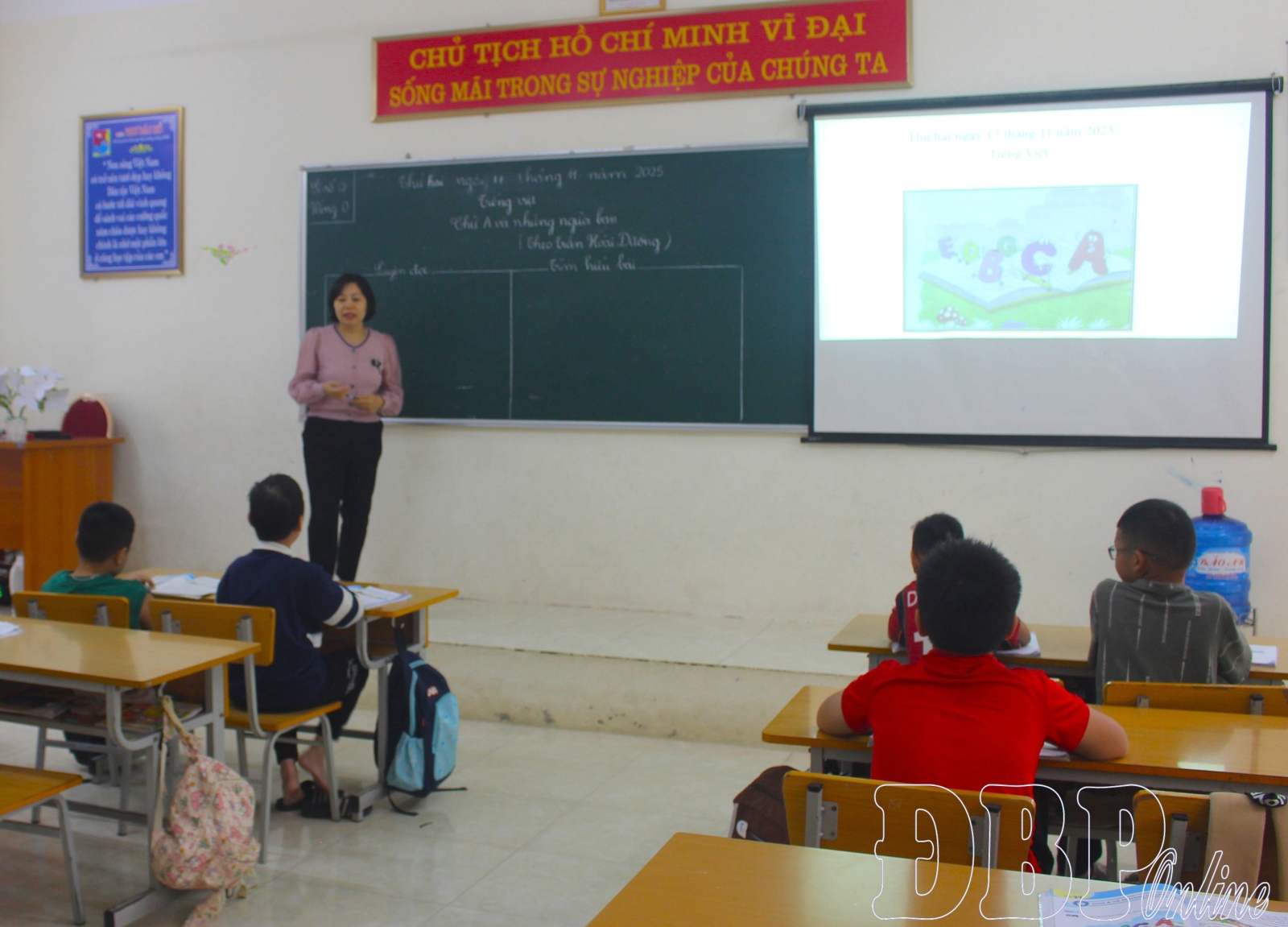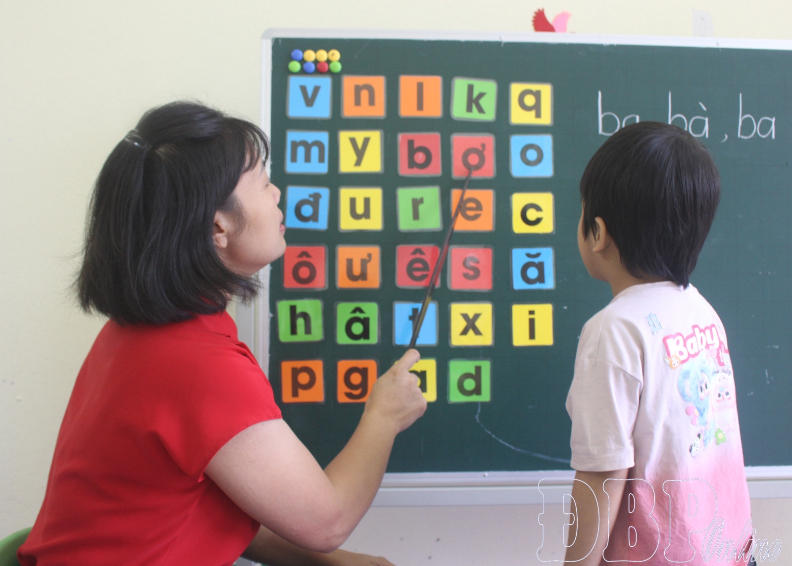 Đào Thị Thanh Phương, one of the two teachers in charge of the class, is patiently sitting next to a deaf student. Using visual aids combined with sign language is how Phương teaches vocabulary to the children.