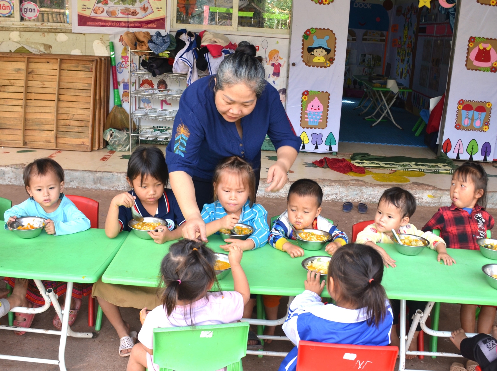 We arrived at Huổi Quang School Site (Mường Chà commune) just as the teacher and students were preparing lunch. In the small school, Lò Thị Thùy Dương (a teacher at Pa Tần Kindergarten) - who has been dedicated to the profession for nearly 17 years - gently went from table to table checking the students’ meals. After three years of teaching in Huổi Quang village, Dương is familiar with the challenges of the “multiple-lack village”: No electricity, no internet, no phone signal, and difficult, arduous roads.