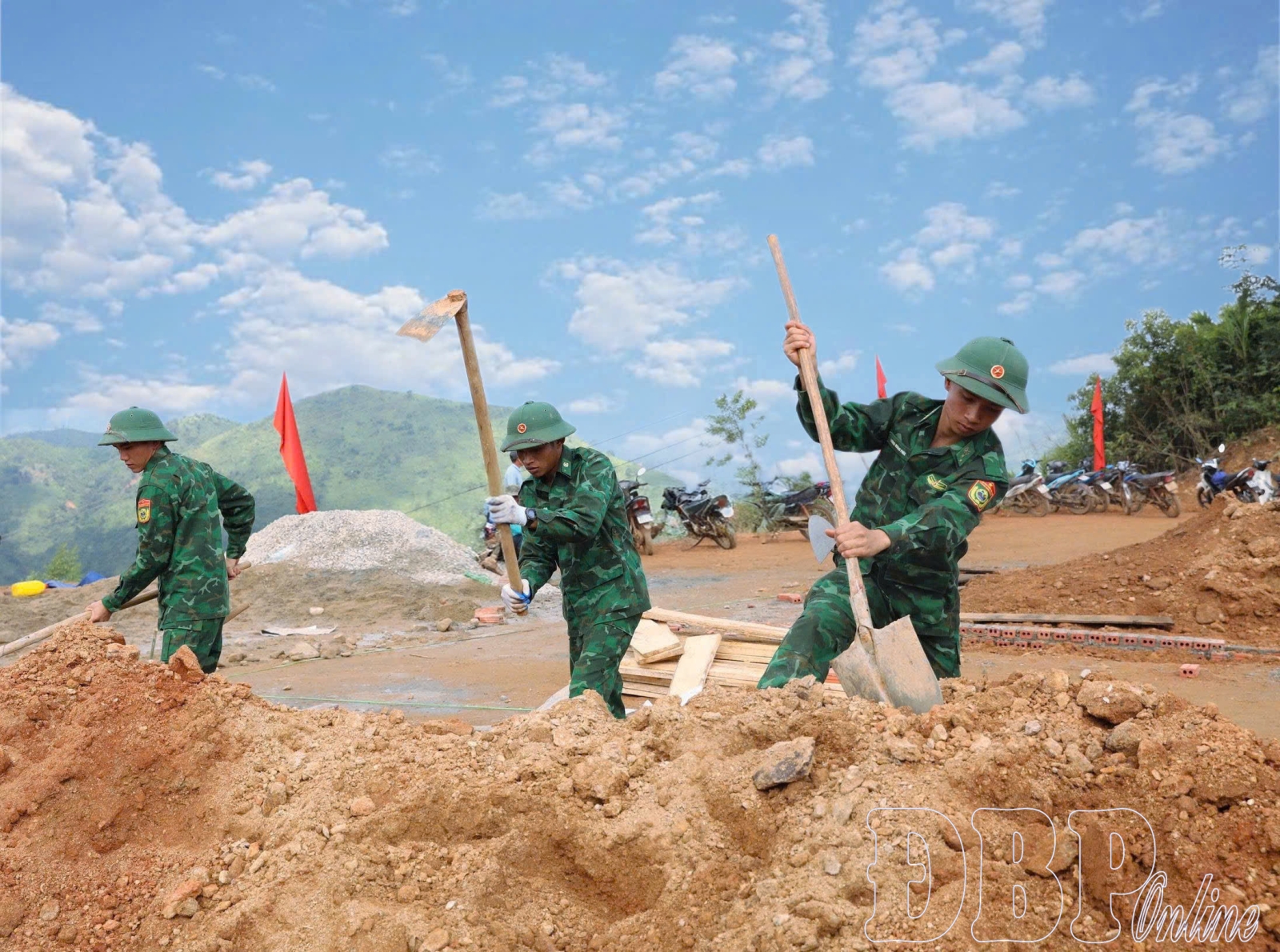 When the floods receded, the roads became muddy and filled with sludge; many houses were damaged, littered with rocks and soil. Once again, the armed forces provided timely support to the people. A special program was launched: “30 Days of High Speed - Reaching the Finish Line.” On August 29, 2025, at the Háng Pu Xi resettlement area in Xa Dung commune, a ceremony was held to launch the campaign to build new houses and repair old ones for people in the flood-stricken region. Hundreds of officials and soldiers from the armed forces spread out to the villages, coordinating with the local government and people to level ground, dig foundations, erect frames, and lay roofs. The sounds of saws and hammers mixed with shovels, creating an urgent atmosphere at these “special construction sites” in the highland area.